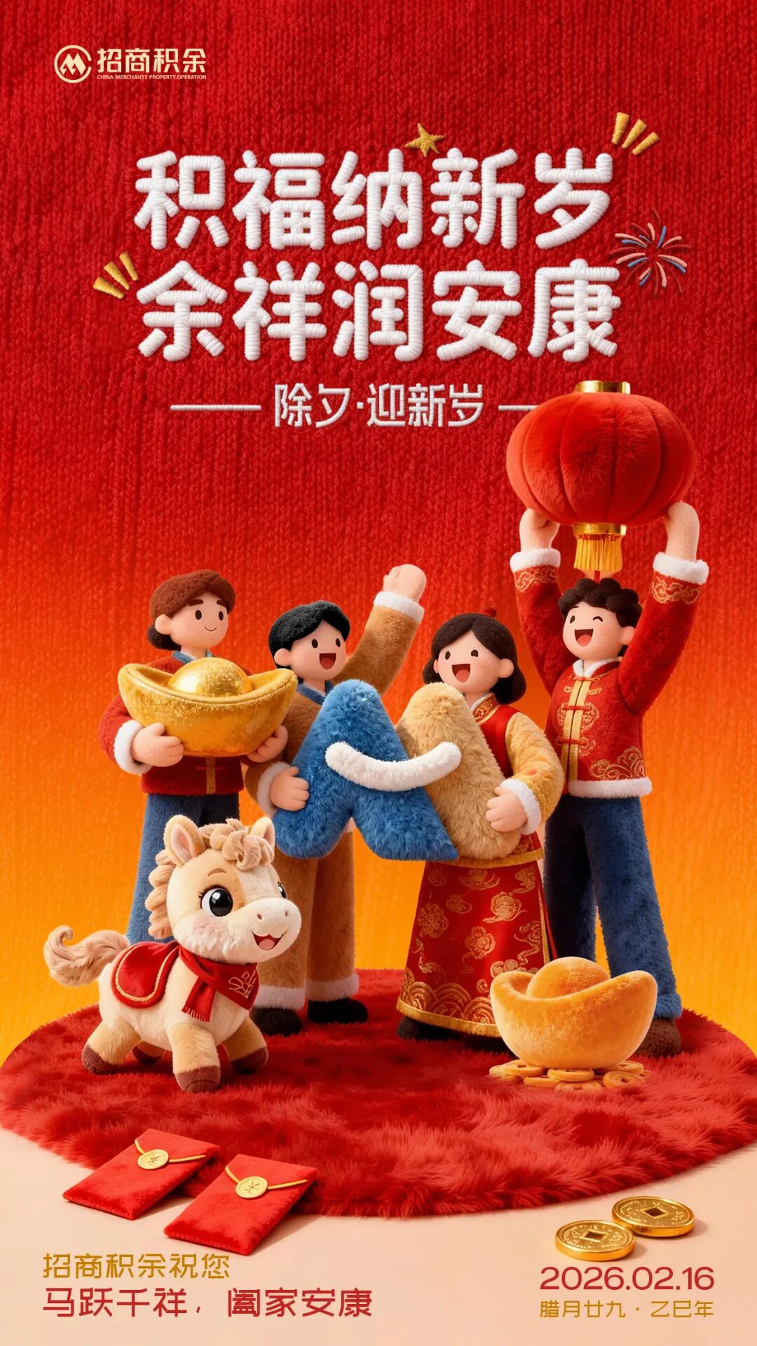 值此大除夕团圆之际,招商积余(001914)向耐久以来眷注救济公司发展的各级领导、配联合伴、纷乱客户,以及奋战在寰宇各神色一线的举座同慈爱缄默奉献的家东说念主们,致以最诚实的新春致意和最好意思好的节日道贺!
